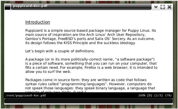 zathura is a highly customizable and functional ereader. It provides a minimalistic and space saving interface as well as an easy usage that mainly focuses on keyboard interaction. zathura now uses a plugin based system for supported document types which makes it possible for you to choose which file formats you want your version of zathura to support. This also makes it possible to use different backends for the same document type: For instance we provide a plugin for PDF documents using either the poppler or the mupdf library.