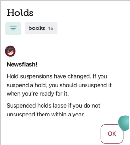 Libby, a popular online app for free access to books from your local library via e-reader or phone, has made significant changes to its hold system. In Libby, if the e-book or audiobook you want is already in use by other readers, you can place a hold on it. This means you join the queue and when it's your turn (the book becomes "available"), Libby will notify you that you can borrow it. How can an e-book be held? As it's not a physical book. The reason is that the library purchases the rights to e-books from the publishers with certain number of licenses (e.g., 3 copies). Previously, Libby allowed to "suspend" this hold for 7–180 days (thus you could stay in the queue but skip your spot while you are busy). Now the system has changed: if you suspend a hold, you must remove the hold yourself, otherwise it will simply "expire" in a year.