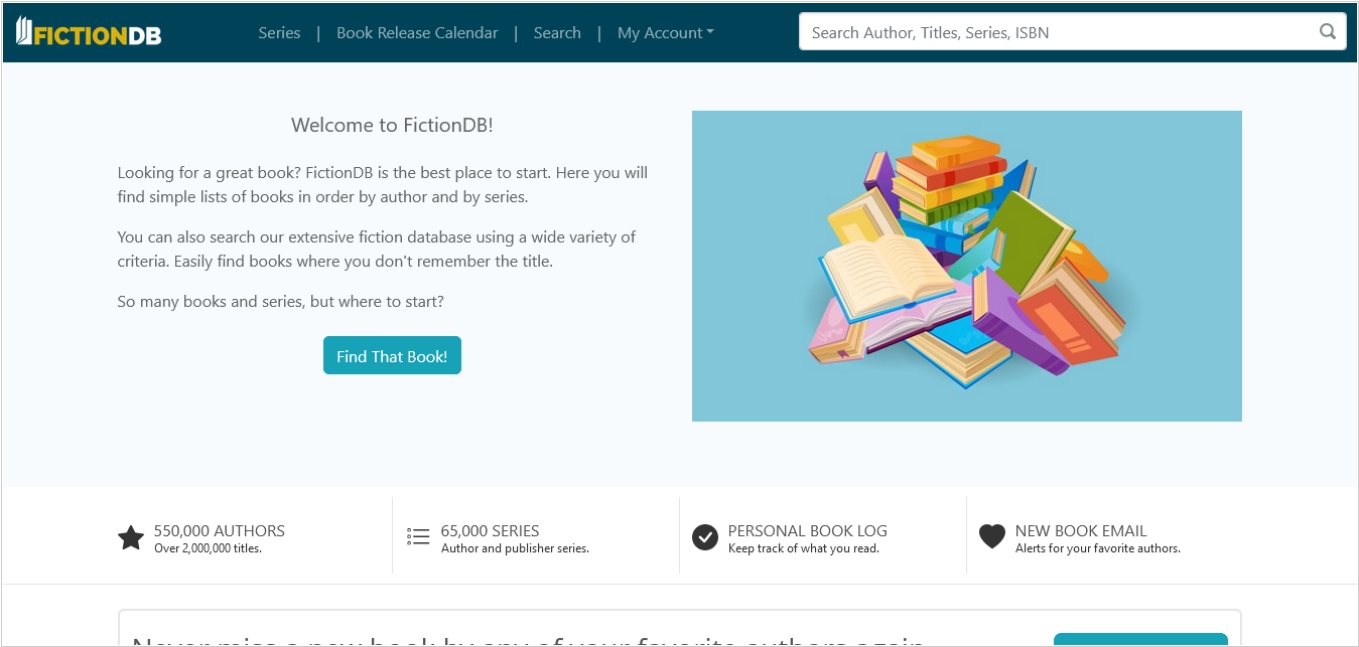 FictionDB is the best place to start looking for a great book. Here you will find simple lists of books in order by author and by series. You can also search our extensive fiction database using a wide variety of criteria. Easily find books where you don't remember the title.