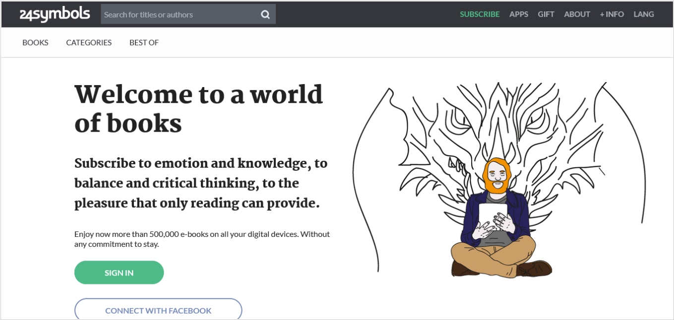 24symbols is a cloud-based platform, and it’s perhaps the cheapest eBook subscription service on the list. Here, you’ll find an expansive selection of history novels, bestsellers, memories, fiction and non-fiction books, and even directories. You’ll also find comics and graphic novels.